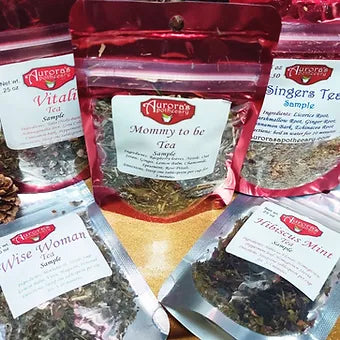 Fill all of your tea fantasies with this sampler set. Get energy to keep up with your kids with Vitali Tea, Enjoy a respite with the revitalizing Hibiscus Mint. Keep you voice while cheering your children on with the throat-soothing Singer's Tea. Prep during your pregnancy for the new addition with the Mommy to Be Tea. We even include a Wise Woman sample to help with keeping your cool and hormones in check. All 5 together with a reuseable muslin bag for brewing them.